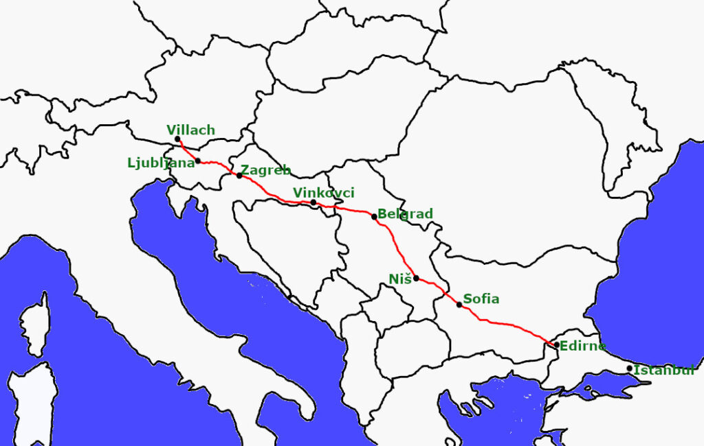 Die Fahrt startet in Villach. Durch den Karawankentunnel geht es bis Jesenice, wo bereits ein erstes Mal die Lok gewechselt wird. In der Nacht fahren wir durch Slowenien, zwischen Ljubljana und Zagreb entlang der Save. Auch Kroatien durchqueren wir noch im Schlaf und wachen kurz vor der serbischen Grenze auf. In Tovarnik und Šid erfolgen die kroatische Ausreise- und die serbische Einreisekontrolle. Tagsüber geht es über Belgrad bis nach Niš, wo der Zug mit ordentlich Verspätung am Abend eintrifft. Eine Diesellok zieht uns bis nach Dimitrovgrad, wo wir Mitten in der Nacht von den serbischen Grenzern geweckt werden. Nach dieser Passkontrolle werden wir wenige Kilometer weiter erneut geweckt, in Kalotina für die bulgarische Eisreisekontrolle. Sofia passieren wir noch im Schlaf, am Mittag erreichen wir dann die bulgarisch/türkische Grenze mit komplizierten Einreiseformalitäten, bis wir mit neun Stunden Verspätung Edirne erreichen.
